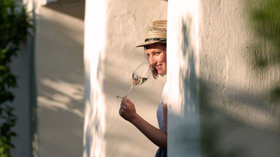 Frau mit Strohhut und Weinglas lehnt an einer Mauer.